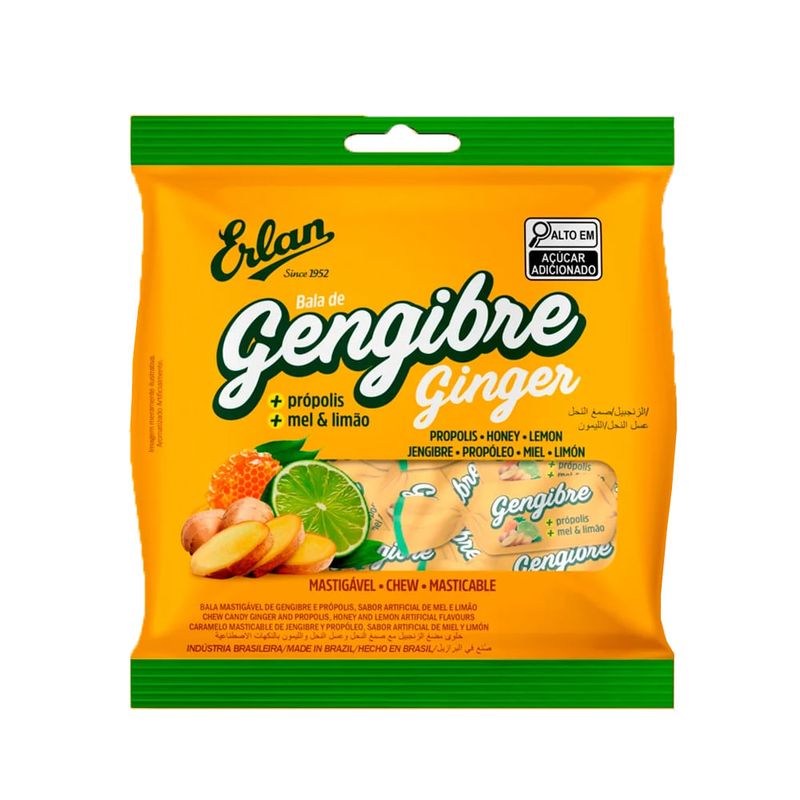 Ingredientes: açúcar, xarope de glicose, gengibre em pó, gordura vegetal, amido de milho modificado, extrato de própolis, emulsificante lecitina de soja e aromatizantes.