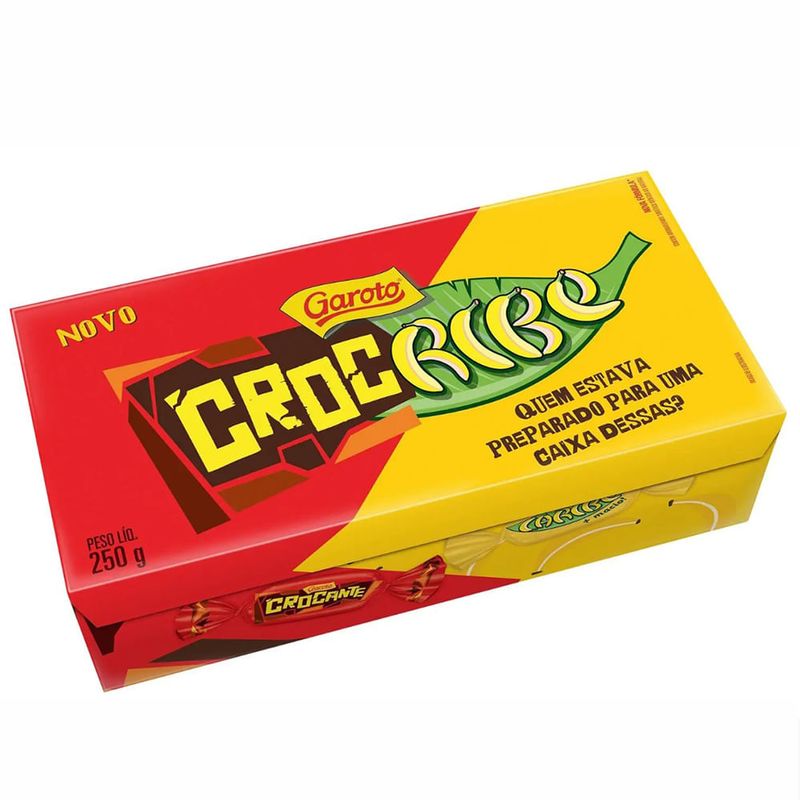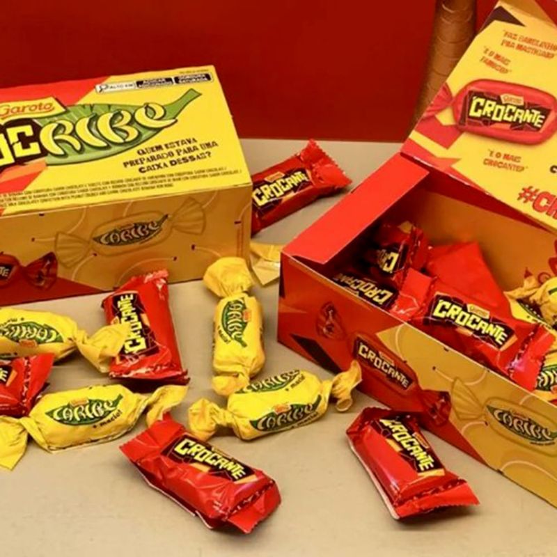Crocante: Tablete com recheio crocante de amendoim com cobertura sabor chocolate: açúcar, amendoim, gordura vegetal, xarope de