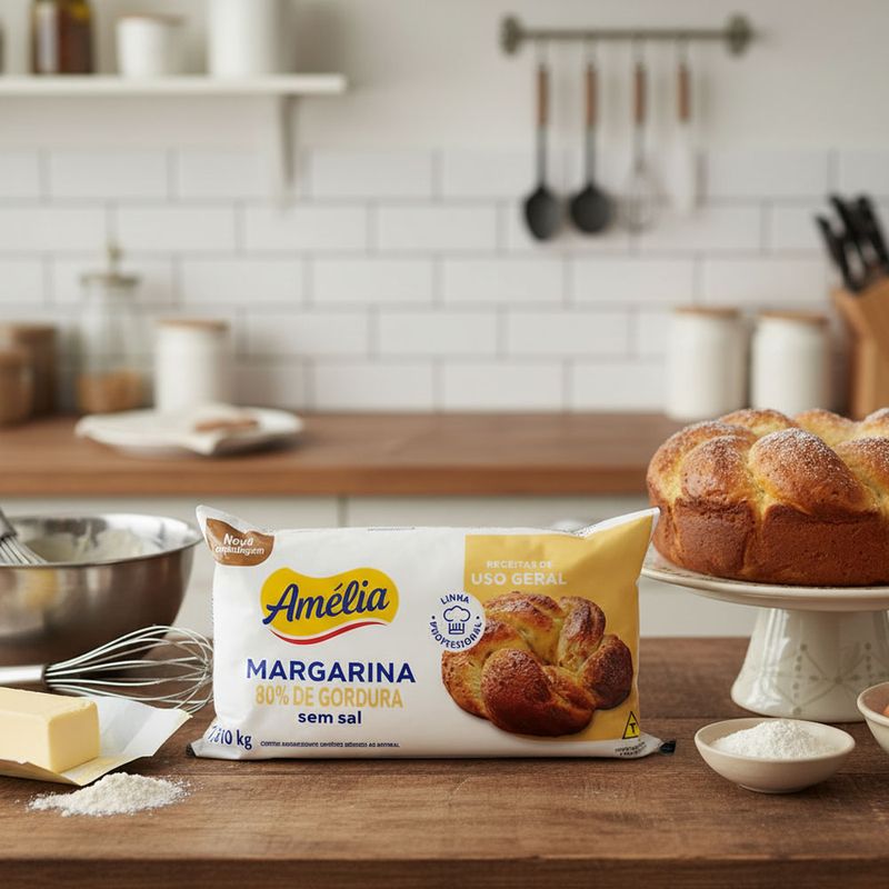 Margarina Sem Sal 80% Gordura Para Bolos Amélia 1,010kg Vigor é desenvolvida especialmente para garantir maciez, leveza e sabor equilibrado em bolos e outras receitas de confeitaria.